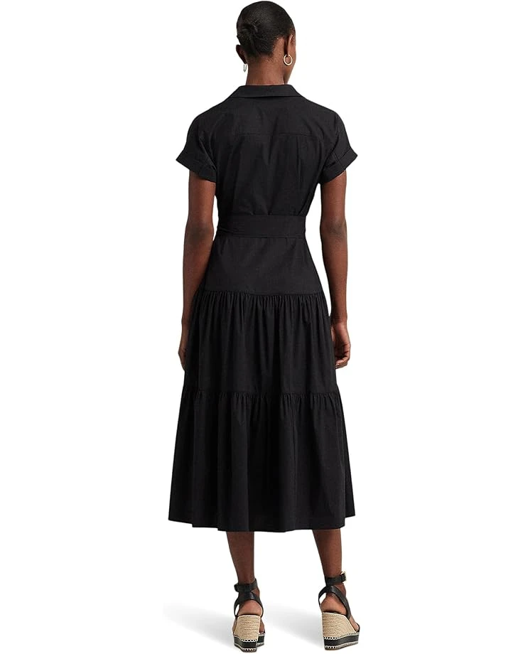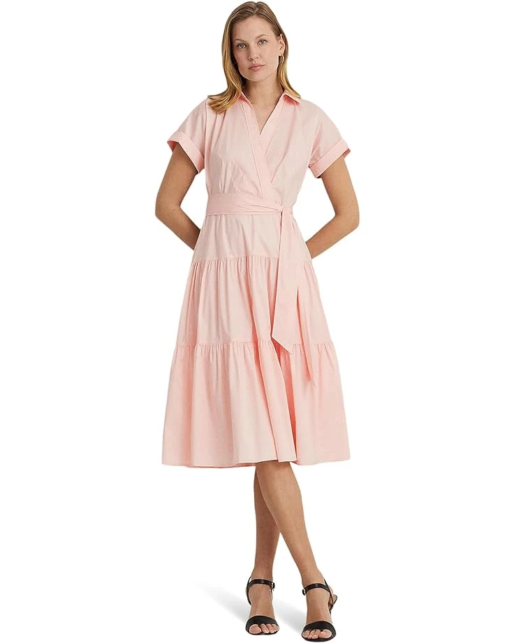 - Reinvent effortless elegance with the LAUREN Ralph Lauren® Belted Cotton-Blend Tiered Dress. Rolled short sleeves and dropped shoulders exude casual sophistication, while a surplice neckline and belted waist enhance the fit and flare silhouette. Enjoy graceful movement with a tiered skirt and pleating details, perfect for any occasion.