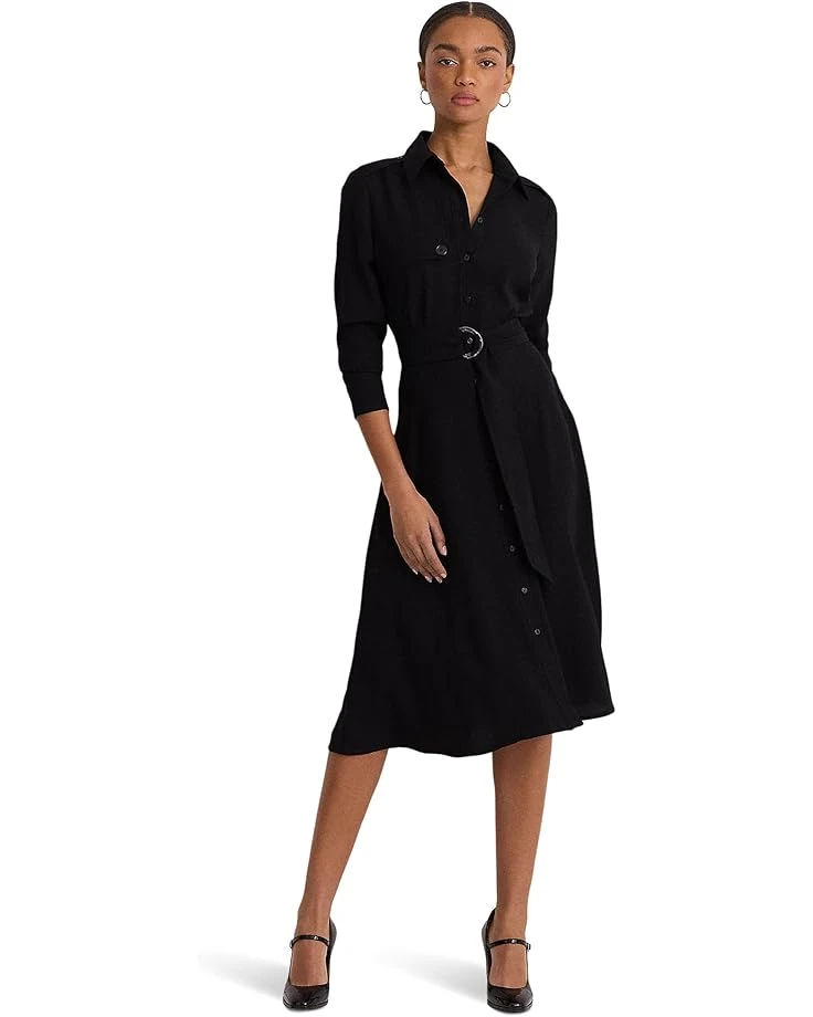 - Leave a lasting impression wearing the LAUREN Ralph Lauren®Belted Double-Faced Georgette Shirtdress. Detailed with traditional trench styling elements, this straight fit dress features collared neckline, long sleeves with buttoned barrel cuffs, buttoned shoulder epaulets, brand name engraved buttons, buttoned storm flap at the left chest and brand name engraved pearlized button. It comes with a D-ring self-belt at the waist for a defined silhouette and threaded belt loops.