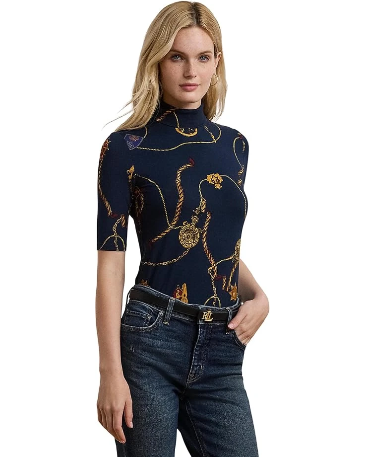 - The striking print pattern embedded over LAUREN Ralph Lauren® Belting-Print Stretch Jersey Turtleneck top offers a unique look. This slim fit top features a turtleneck and elbow-length sleeves. Also, the “LRL”-embroidered logo at the right hem adds a touch of brand detail.