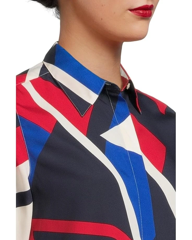 - Crafted with lightweight crepe de chine for a graceful drape, this collared shirt showcases a sailboat-inspired abstract motif. Featuring a point collar, concealed button placket, long sleeves with buttoned barrel cuffs, back yoke, and a shirttail hem.