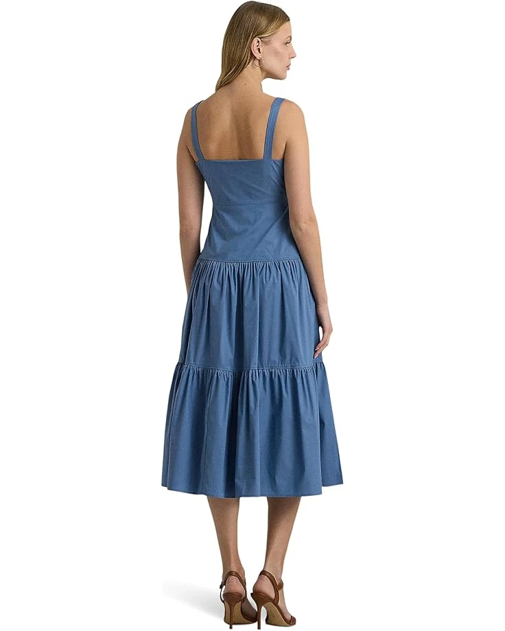 - Infuse some charming vibes into your style donning the LAUREN Ralph Lauren® Cotton-Blend Tie-Front Tiered Dress, that is crafted in an A-line silhouette and silky stretch-cotton blend for a lightweight feel. The dress features a sleeveless design, V-neckline, tie-front accent at the waist that extends from the right & left side-seams, shirring into the tier seams, and tiered skirt that brings effortless movement. It is intended to hit at the ankles.