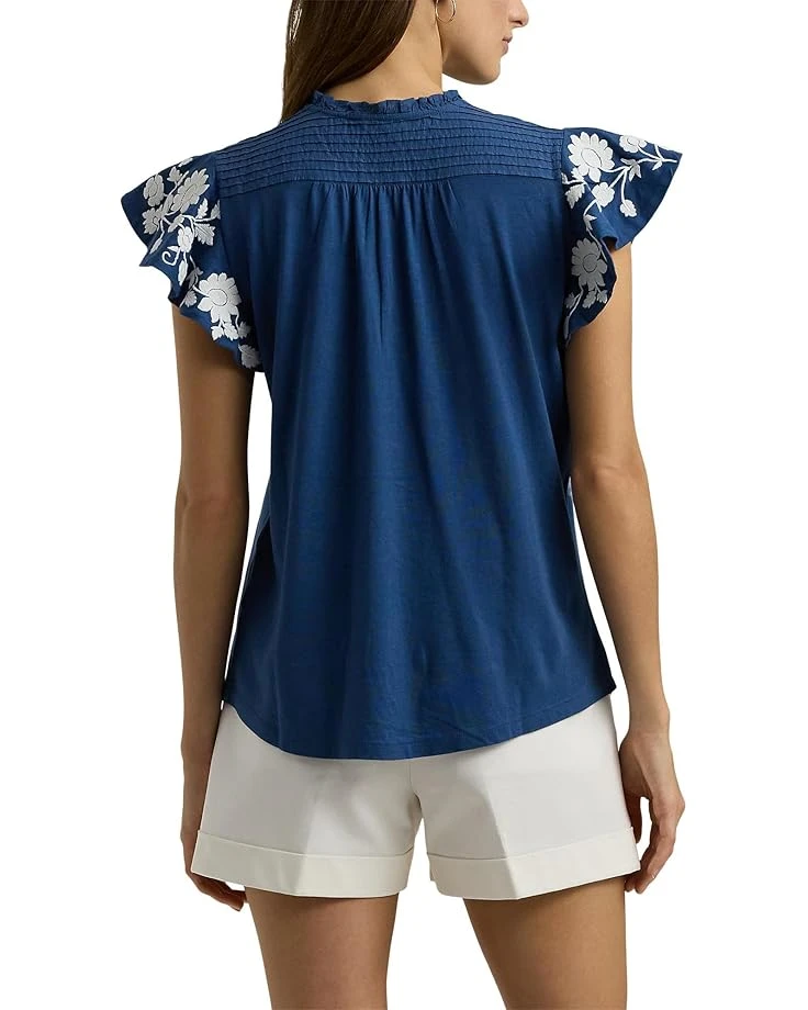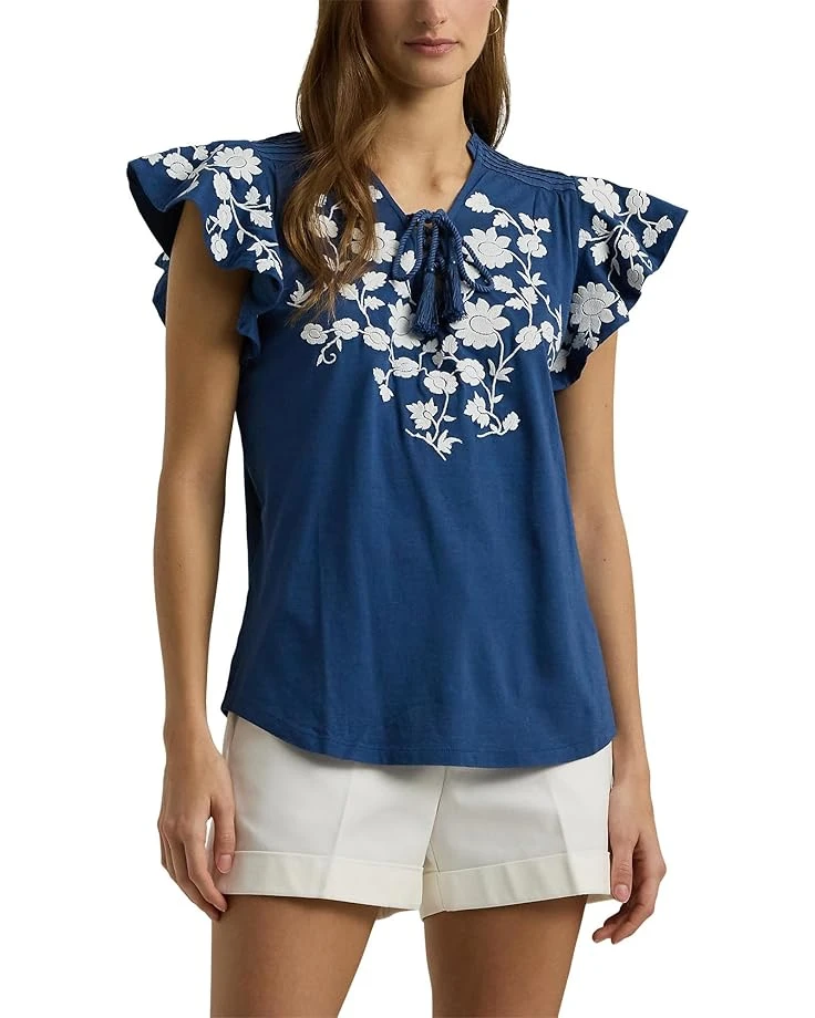 - Designed with an array of feminine elements, the LAUREN Ralph Lauren® Floral-Embroidered Jersey Tie-Neck Top perfectly channels your love for that romantic look. It is tailored in a relaxed fit and comes fashioned with ruffled collar with a lace-up quarter placket and self-tie detailing with beaded tassel cord ends, short flutter sleeves, and pintucked detailing at the shoulders and back yoke.