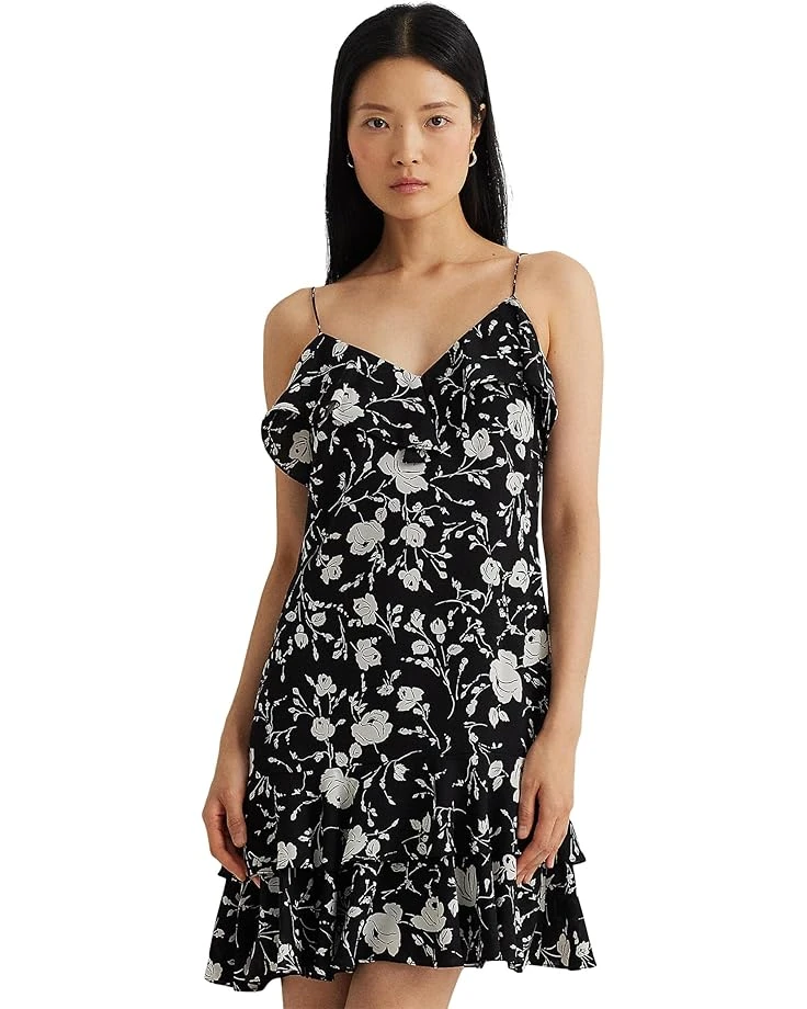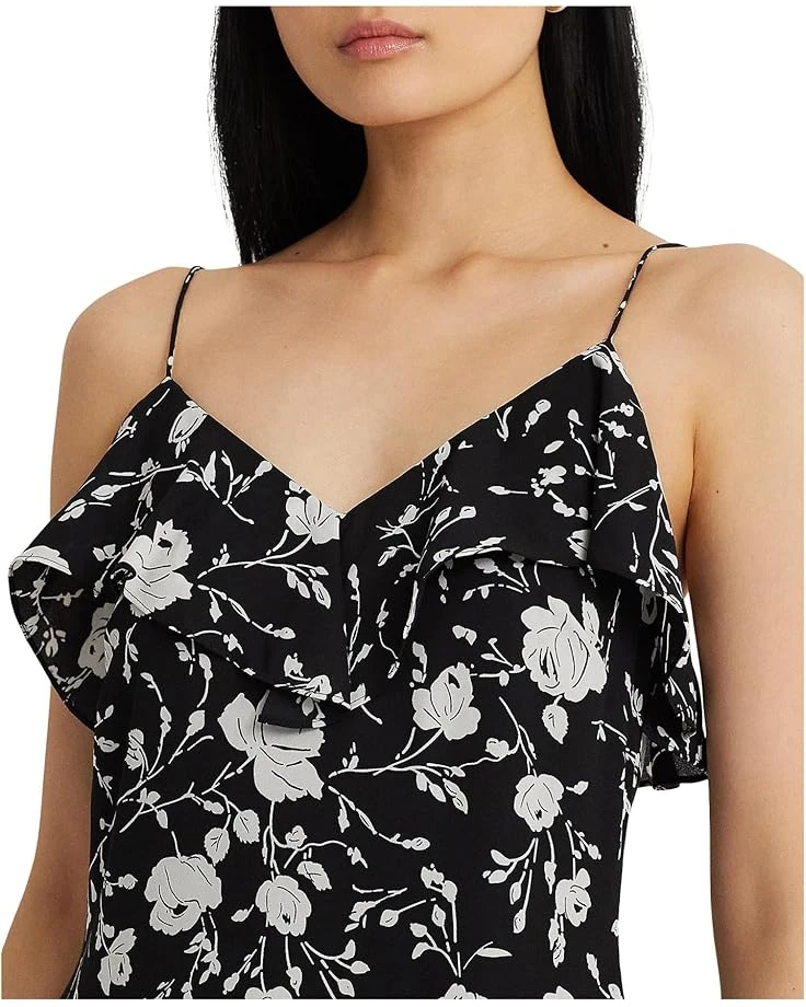 - Embrace the enchantment of sophistication with the LAUREN Ralph Lauren® Floral Georgette Sleeveless Dress − where romance meets modern style. Adorned in a daring rose print, the sheath silhouette and ruffle-trimmed V-neck exude timeless elegance. Spaghetti straps and a tiered skirt create a flirty touch, making every movement a dance of grace.