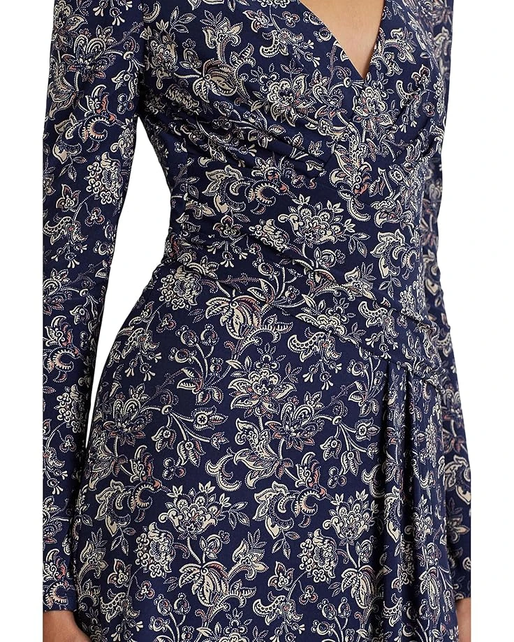 - With its flattering pleated bodice and enchanting floral motif, the LAUREN Ralph Lauren® Floral Stretch Jersey Long-Sleeve Dress effortlessly elevates the fashion statement. The dress comes in an A-line silhouette and features a surplice neckline, concealed center back zipper with a hook-and-eye closure, long sleeves, and pleating at the bodice and skirt.