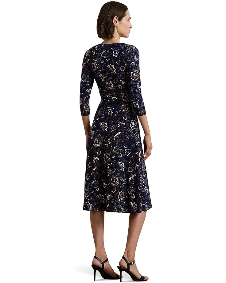 - Featuring an allover floral print, the Lauren Ralph Lauren® Floral Surplice Stretch Jersey Dress works for different occasions. Lined at the bodice, this printed dress comes with a removable self-belt and princess seams on the front bodice. It is styled with three-quarter-length sleeves, a surplice neckline, and a straight hem.
