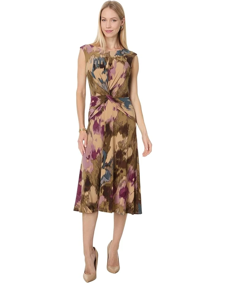 - Styled with an eye-catching twist-front detail on the front, the LAUREN Ralph Lauren® Floral Twist-Front Jersey Dress works for most occasions. The stretch-infused jersey fabric of the dress offers a comfortable feel and a better range of movement. This printed dress comes with cap sleeves, a round neckline, a zippered back closure, and a straight hem. Lined on the bodice for better coverage, this midi dress is perfect to make your style statement.