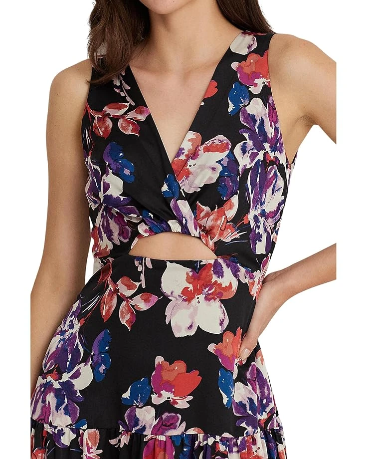 - Flaunt a statement everyday look by wearing the LAUREN Ralph Lauren® Floral Twist-Front Mousseline Dress. The sleek dress features a V-neckline, a wrap-around silhouette, sleeveless construction, and a hook-and-eye closure. The adorable dress has a cut-out at the bodice for a modern finishing touch with a tiered skirt silhouette and shirring into the tier seams. It boasts a twist-front accent with a fit-and-flare silhouette that complements your curves effortlessly.