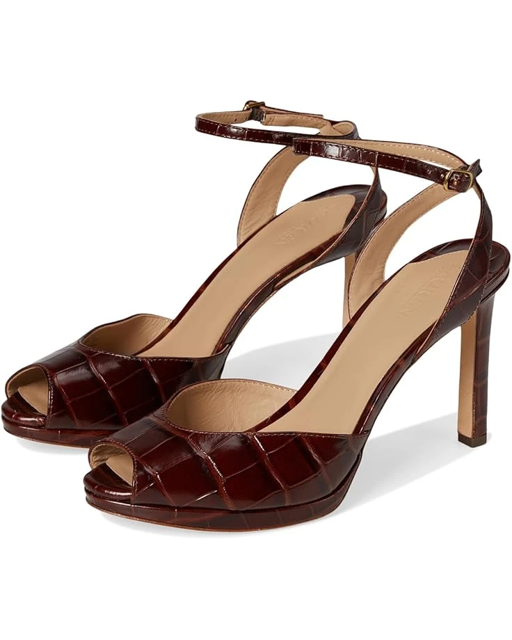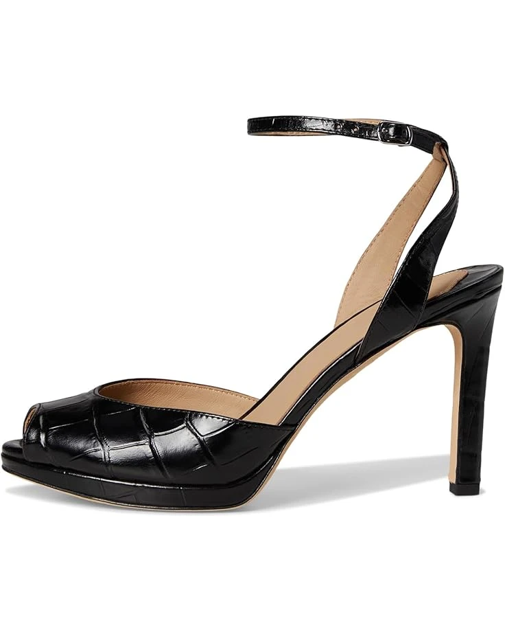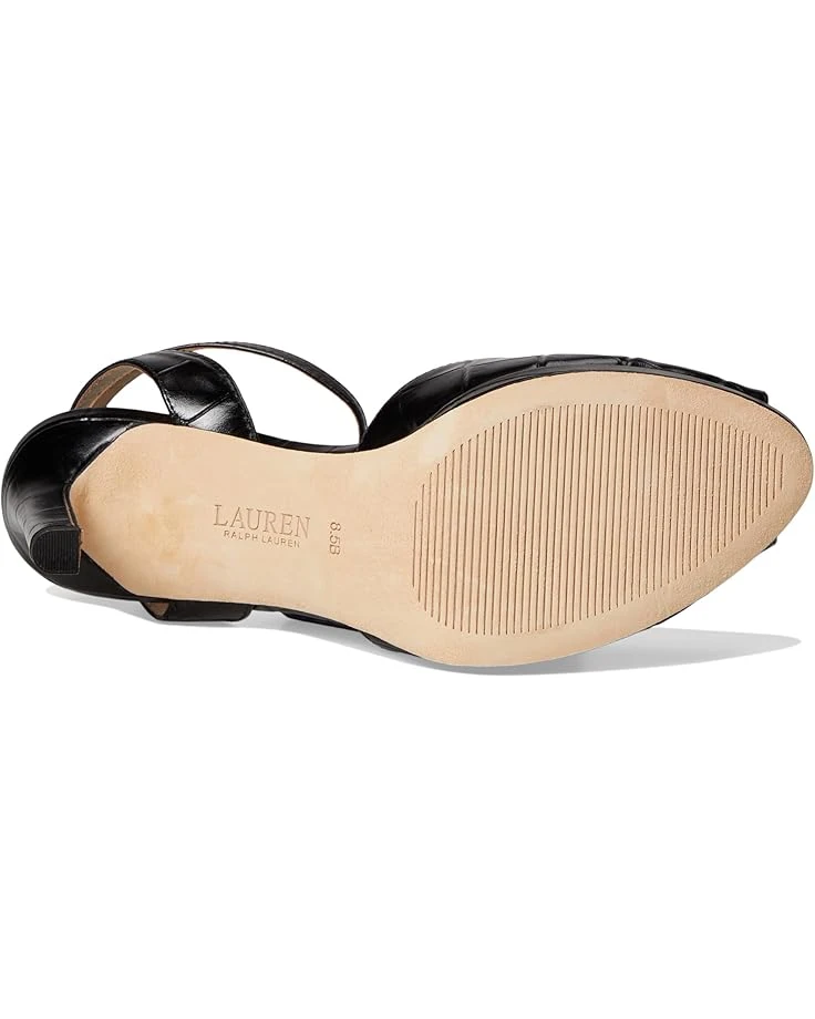 - Glossy crocodile-embossed leather brings subtle dimension and a luxurious sensibility to the Lauren Ralph Lauren® Kyla Crocodile-Embossed Leather Sandals, which is equipped with stiletto heels for a leg-elongating effect. A crisscross ankle strap and peep toe design add modern appeal, while padded insole offers comfort with each step.