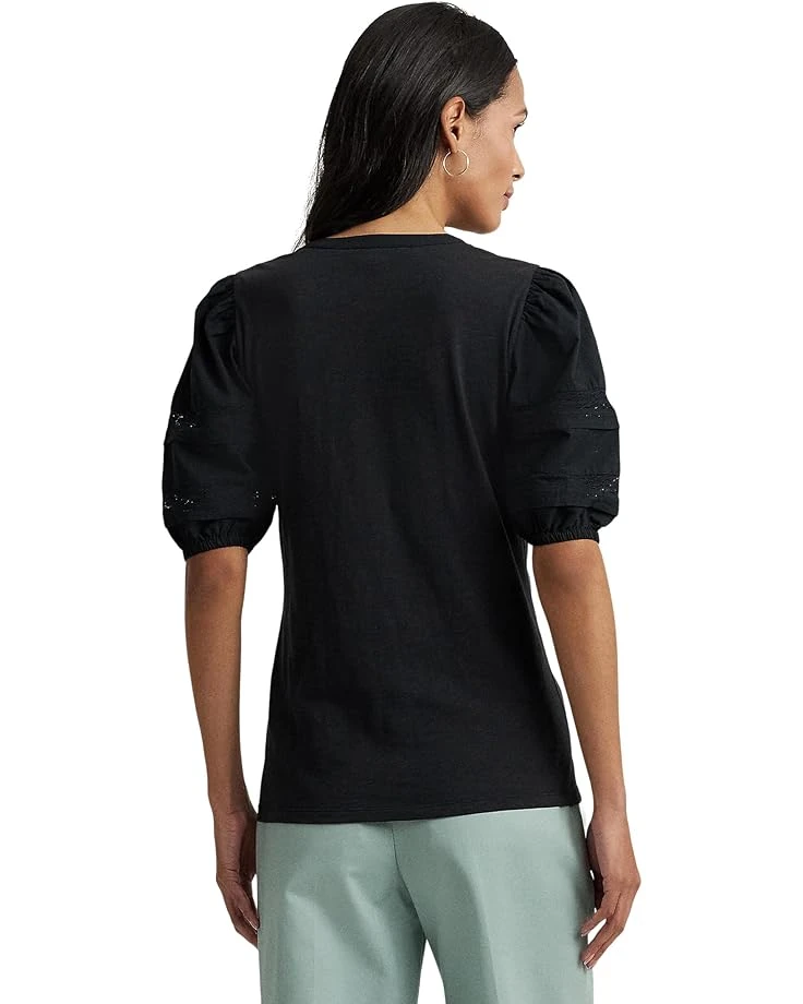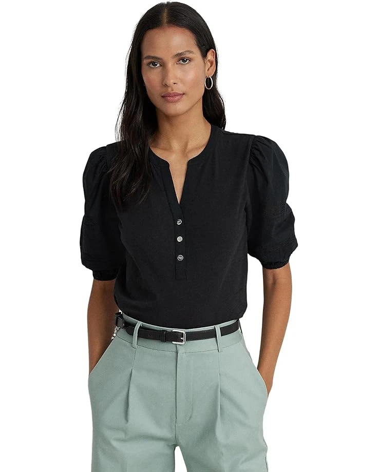 Lauren Ralph Lauren Lace-Trim Jersey Puff-Sleeve Henley Tee | Shirts & Tops