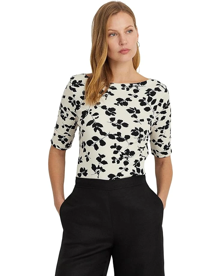 - Experience the power of a fashionable look donning the LAUREN Ralph Lauren® Leaf-Print Stretch Cotton Boatneck Tee. It is designed with elbow-length sleeves with folded cuffs, allover iconic print for a pleasing touch, and straight hemline with side vents. Crafted with a stretch-infused cotton-printed fabric.