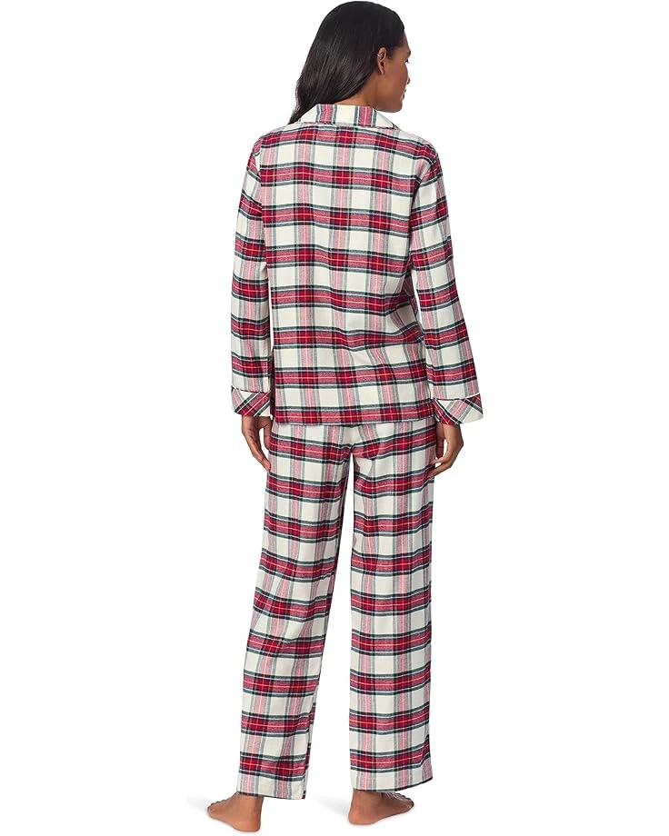 - Indulge in cozy wearing the Lauren Ralph Lauren® Long Sleeve Brushed Twill Notch Collar Pajama Set. This classic fit, long sleeve brushed twill notch collar PJ set has large plaid pattern allover. Featuring button front closure, straight hem, and one chest pocket with brand logo. It has straight leg bottom, with drawstring waistband.