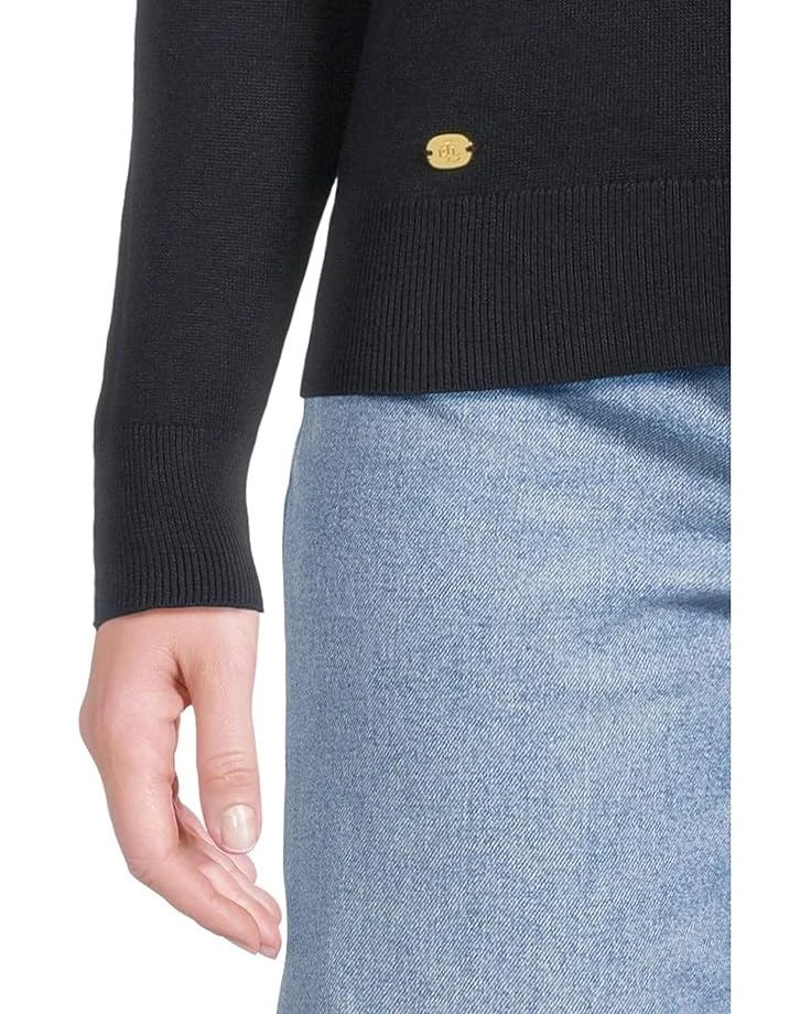Thank you Zappos for offering petite size clothing!!! I ordered this sweater in both orange (very fun) and ivory (nice shade) colors in my usual petite-medium size. The fit was rather cropped and close to the body – which I expected. However what was unimpressive was the material: it was a simple, close-knitted cotton that was not soft to the touch or laid well against the skin. And dry-clean-only too? It was returned.