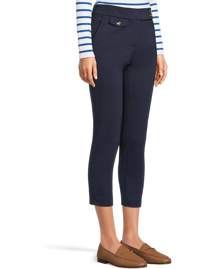- Keep it stylish wearing the Lauren Ralph Lauren® Petite Ponte Ankle Pants. Crafted from a smooth ponte construction with a hint of stretch for comfort and ease of movement, these tailored ankle pants feature a slightly tapered silhouette. They have a high-rise waist and a straight fit that tapers slightly at the leg, intended to hit at the ankle. The pants feature a zip-fly with an extended waist tab and a two-button closure, along with goldtone “LRL”-engraved metal buttons on the waistband. The design includes two front waist angled pockets, two back waist welt pockets, and a decorative front right waist buttoned flap with a goldtone button.