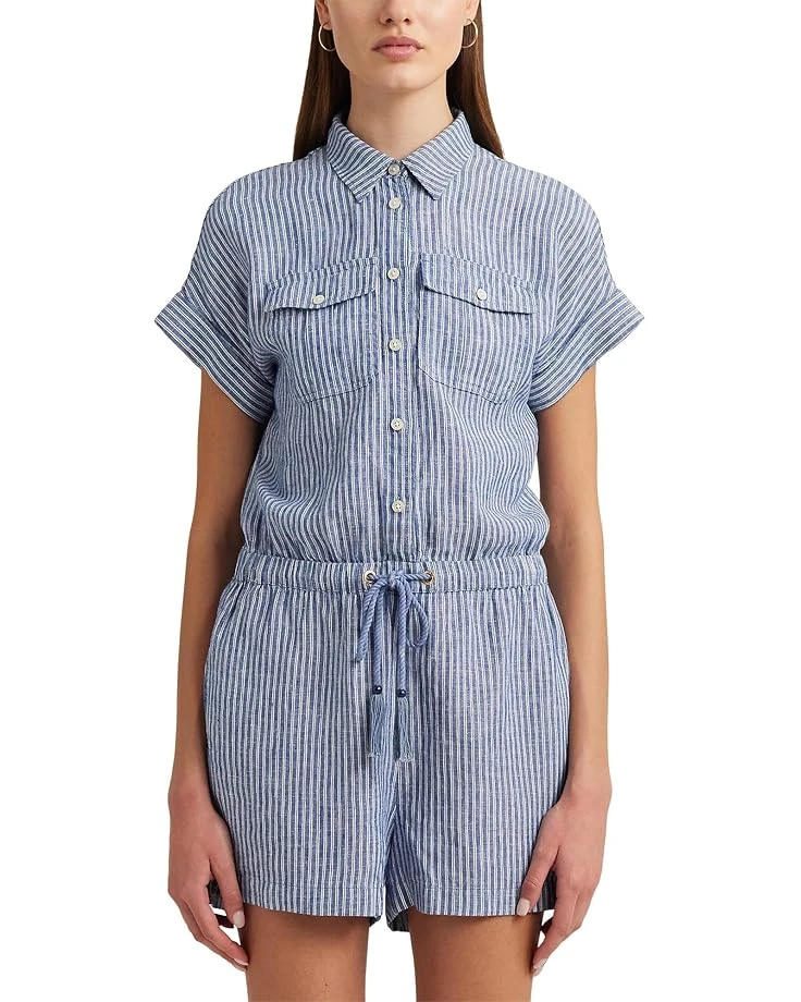 - Look simple yet elegant wearing the LAUREN Ralph Lauren® Pinstripe Linen Shorts-Sleeve Romper. This relaxed fit jumpsuit features point collar neckline, short sleeves with rolled cuffs, elasticized draw cord waistline with beaded tassel cord ends and brand name engraved buttoned half placket.