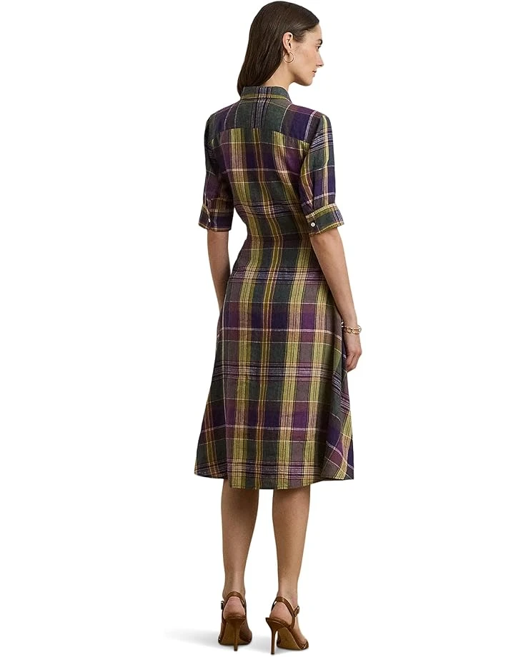 - Make a striking statement at the next occasion wearing Lauren Ralph Lauren® Plaid Tie Front Linen Shirtdress. the fit-and-flare dress features a point collar, a concealed buttoned placket, elbow-length sleeves with buttoned barrel cuffs, “Lauren Ralph Lauren®”-engraved buttons at the collar & cuffs, slant pockets, a tie-front accent at the waist, and back yoke. This version is updated for the season with a vibrant, yarn-dyed plaid pattern.