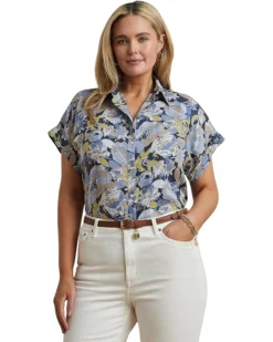 - Amp up your style game wearing the fun and casual Lauren Ralph Lauren® Plus Size Broono Short Sleeve Button Front Shirt. A relaxed silhouette and rolled cuffs enhance the effortless character of this short-sleeve collared shirt, which is tailored with linen for a soft, lightweight feel. Detailed with signature engraved buttons, this version highlights the season’s painterly floral motif.
