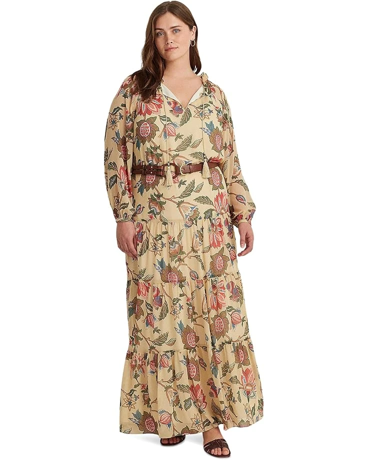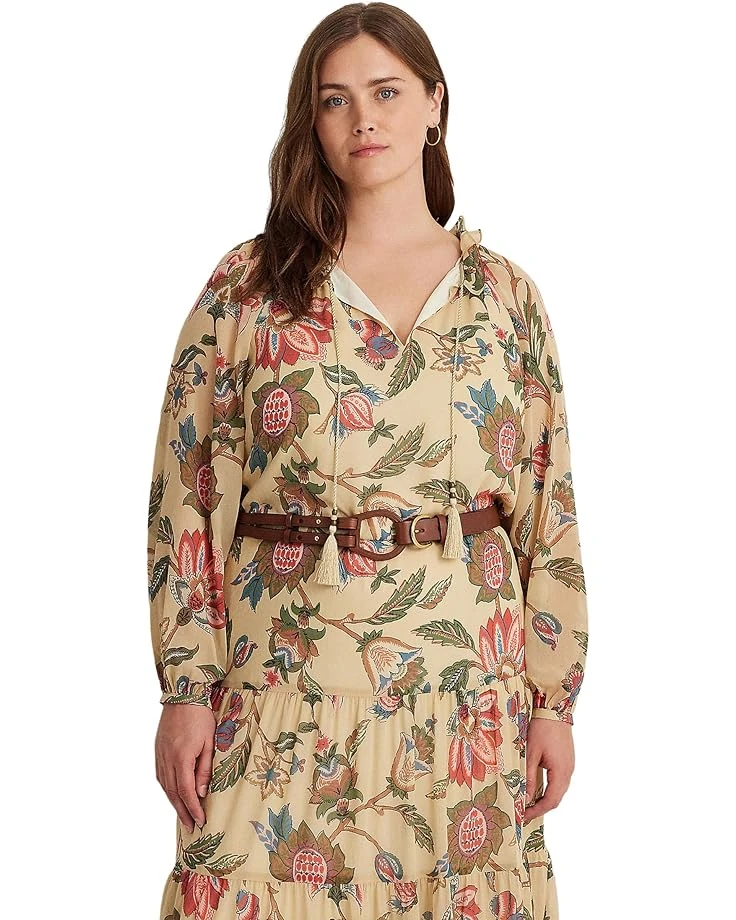 - Redefine comfort luxury wearing the soft and lightweight LAUREN Ralph Lauren® Plus-Size Floral Crinkle Georgette Tiered Dress. It features a V-neckline with tasseled ties, raglan seams, self-tie belt detail along the waist, and long tiered skirt for unrestrained movement.