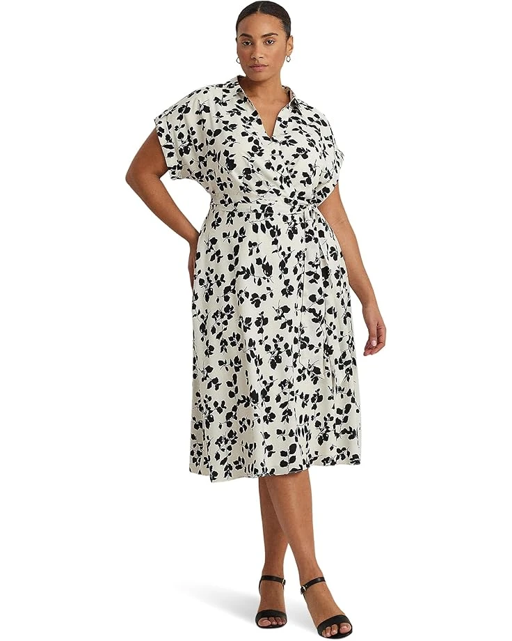 - Define sumptuous luxury in your fantabulous look wearing the LAUREN Ralph Lauren® Plus-Size Leaf-Print Belted Crepe Dress. It features a surplice neckline with spread collar, short roll-tab sleeves, removable self-belt, and A-line silhouette.