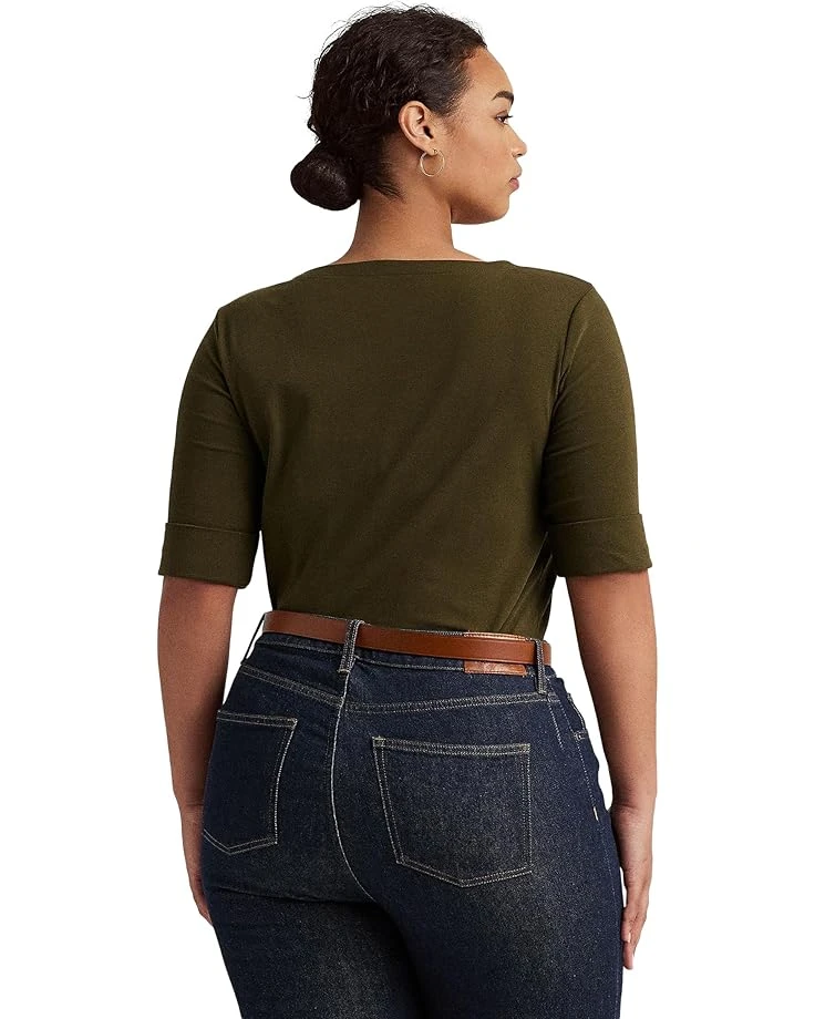 - The LAUREN Ralph Lauren® Plus Size Stretch Cotton Boat Neck Tee offers endless versatility with a bateau neckline, elbow-length sleeves with cuffs, and signature monogram embroidery at the hem.