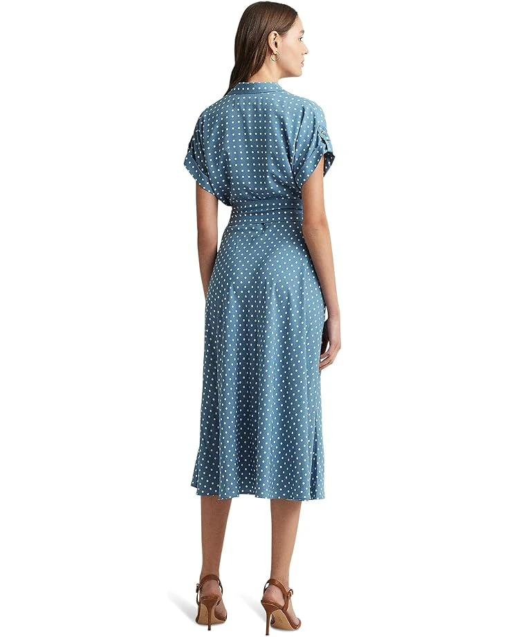 - Immerse yourself in an era of eternal gracefulness embodied by the LAUREN Ralph Lauren® Polka-Dot Belted Crepe Dress. Crafted for effortless charm, this A-line silhouette dress features a spread collar and a surplice neckline. With short roll-tab sleeves and ‘LRL’-engraved buttons, it offers a blend of sophistication and versatility. Complete with a removable self-belt for personalized styling.