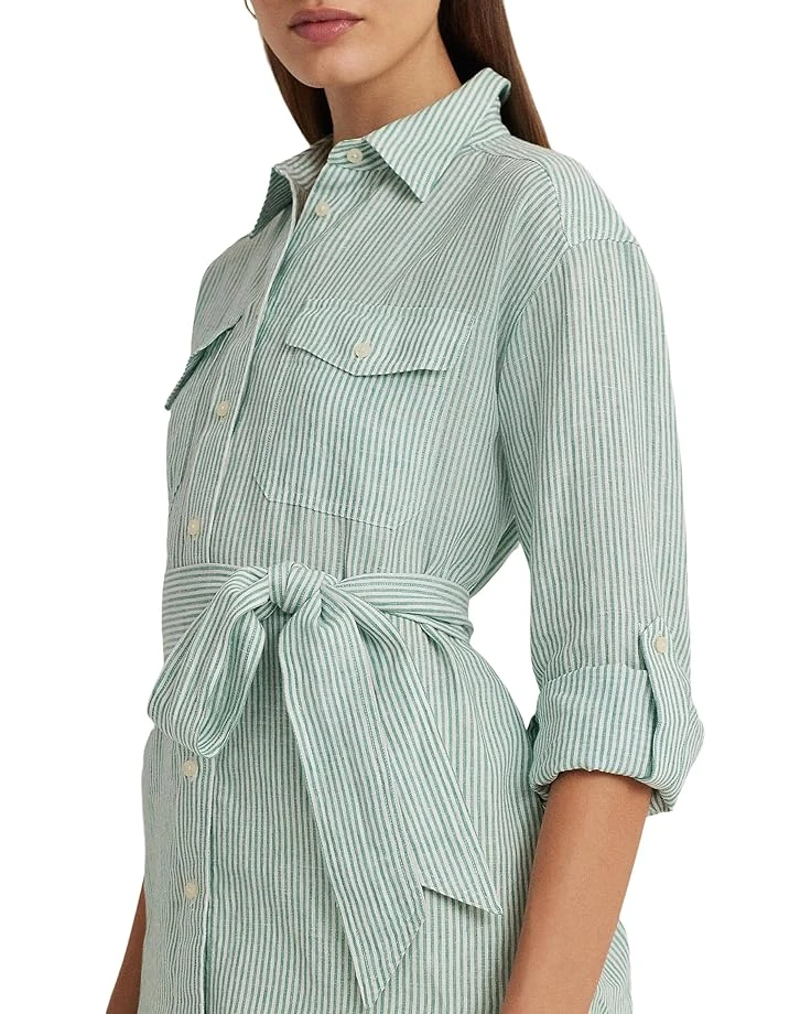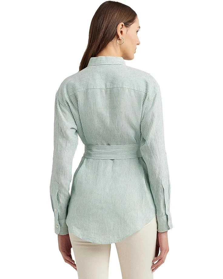 - Keep your style game upbeat in the trend-setting LAUREN Ralph Lauren® Relaxed Fit Striped Belted Linen Shirt featuring a point collar with long roll-tab sleeves that come with buttoned barrel cuffs and dropped shoulders. Made from a lightweight linen jersey with yarn-dyed vertical stripes that complement it’s buttoned front placket featuring “Lauren Ralph Lauren”-engraved buttons.
