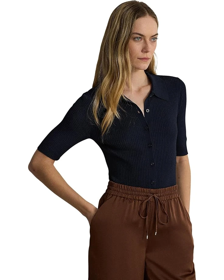- The LAUREN Ralph Lauren® reimagines the iconic Polo as a cardigan with a rib-knit construction and elbow-length sleeves, cut for a slim silhouette. This timeless piece features a ribbed Polo collar and a buttoned placket adorned with “Lauren Ralph Lauren”-engraved pearlized buttons, adding a touch of luxury to the design.