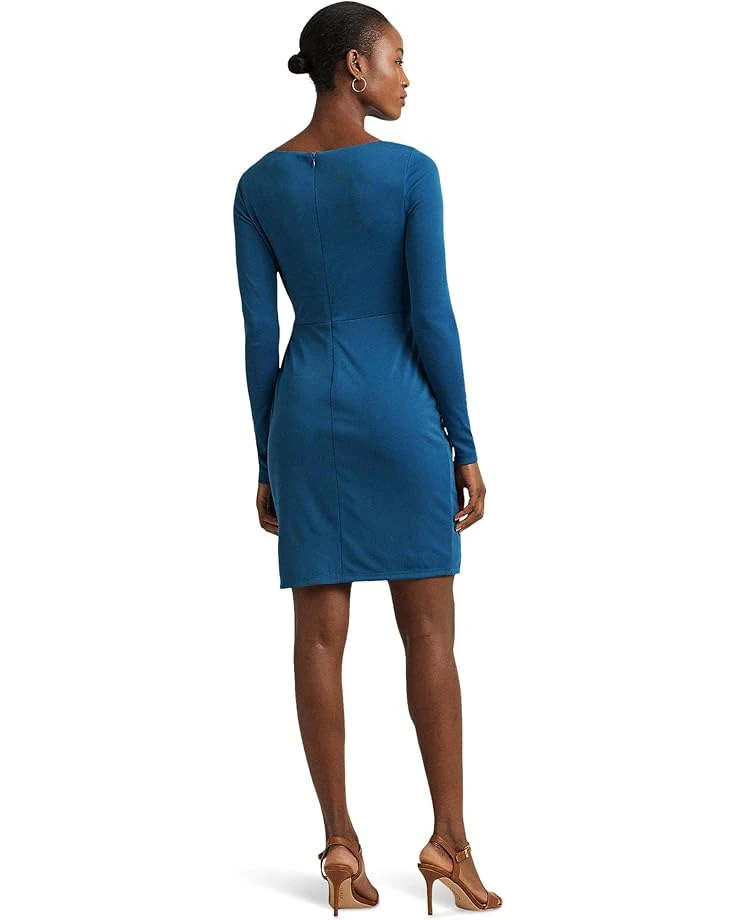 - Elegantly embody sophistication in the LAUREN Ralph Lauren® Ring-Trim Stretch Jersey Cocktail Dress. This sheath silhouette stuns with a surplice neckline and long sleeves. The faux-wrap skirt overlay, secured by an “LRL”-engraved metal buckle, creates a flattering drape. With pleating for a structured look and a concealed back zipper, it’s a masterpiece of style and convenience.