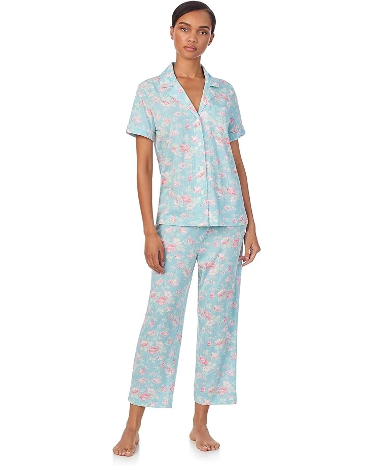 - Dreamy comfort meets effortless chic! Unwind in style wearing the Lauren Ralph Lauren® Short Sleeve Knit Cropped PJ Set, featuring a timeless notch lapel collar and breezy short sleeves. A charming floral print and button-front closure add a touch of elegance, while the chest pocket offers a practical detail. The elasticized waist and pull-on pajama bottoms ensure a perfect fit and ultimate relaxation. This cropped set combines luxurious softness and a flattering silhouette, making it ideal for cozy nights or lazy mornings.