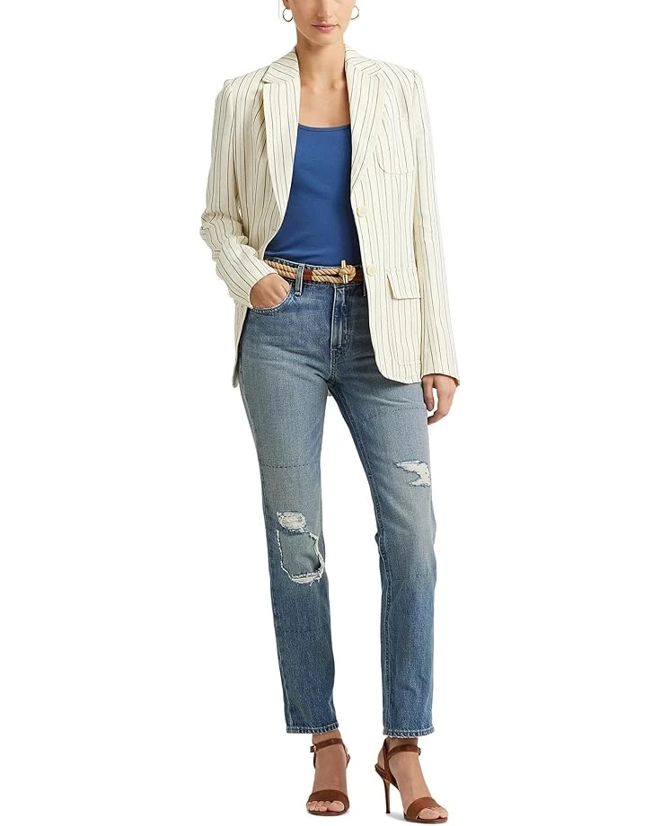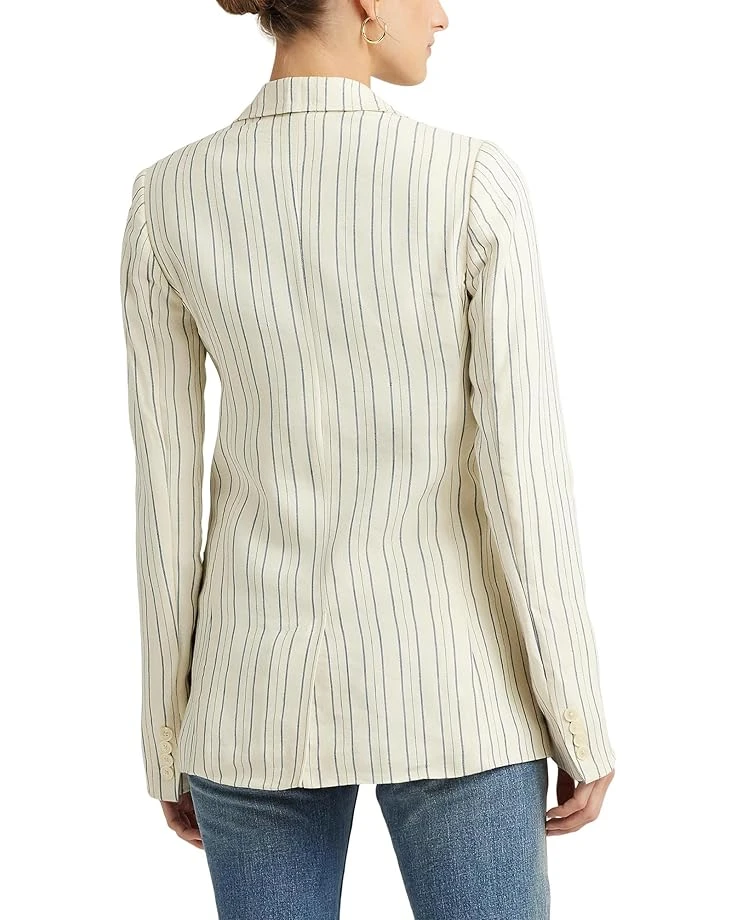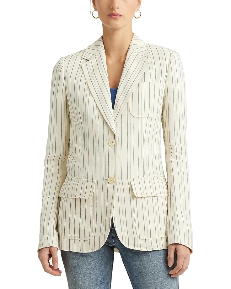 - Maintain your charming style when you layer your look with the LAUREN Ralph Lauren® Striped Cotton-Blend Blazer. Crafted with a lightweight fabrication that includes cotton and linen, this refined blazer features a menswear-inspired silhouette, shoulder pads, and slender, yarn-dyed stripes.