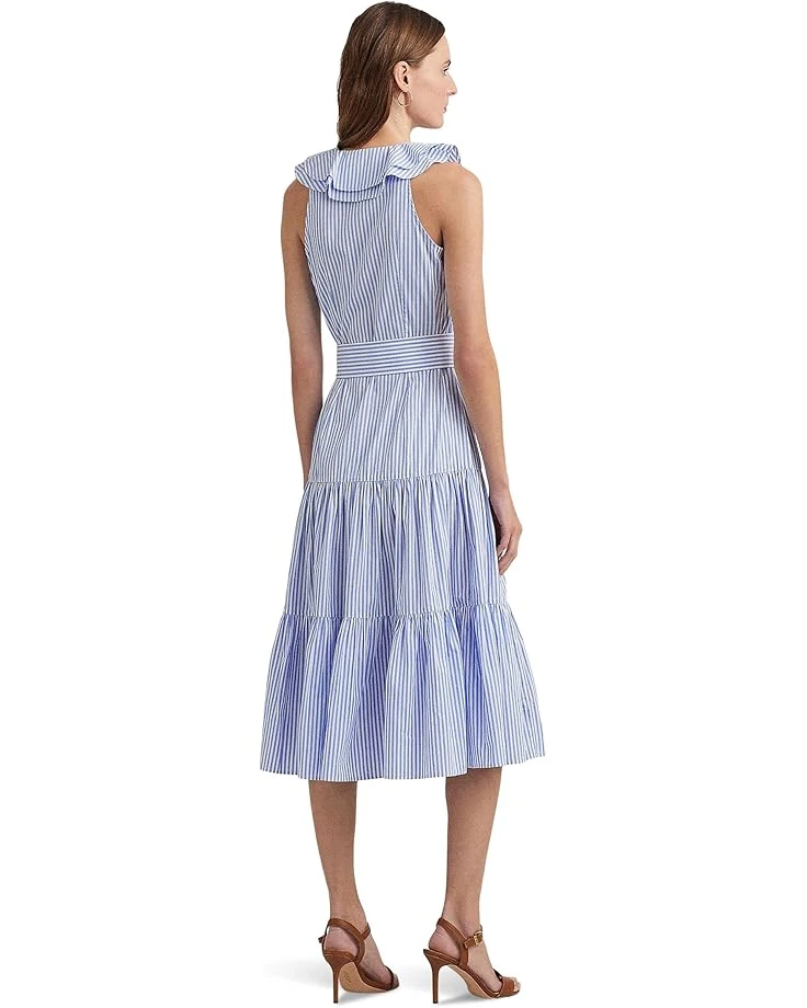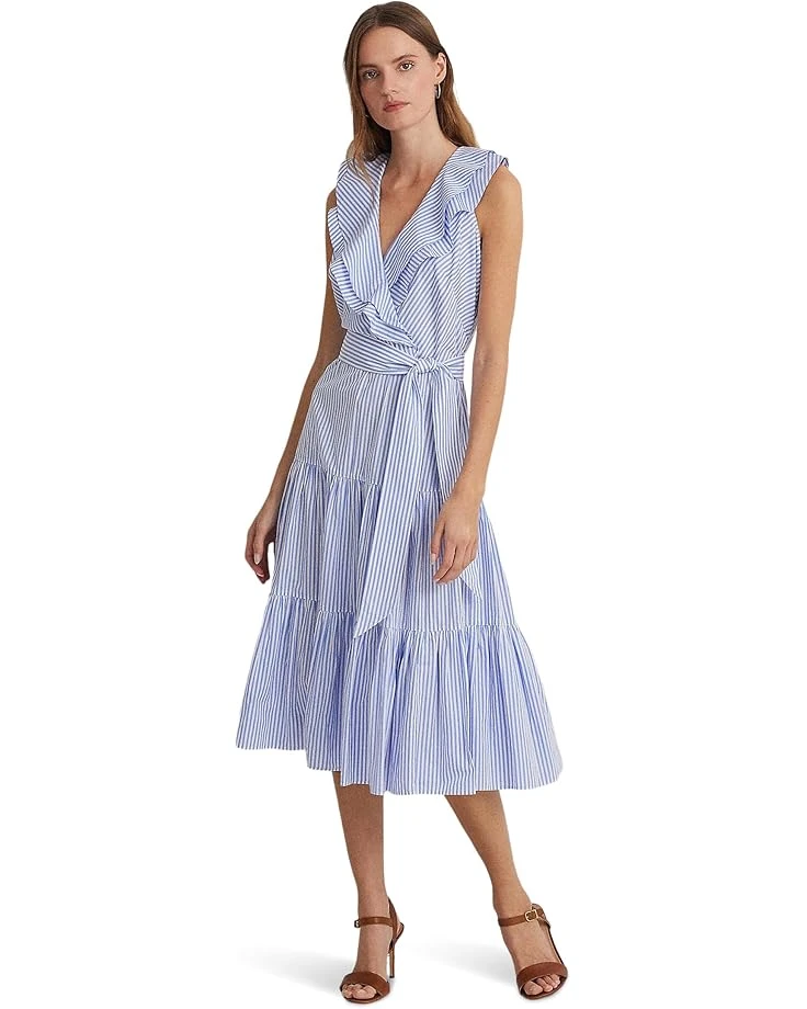 - Styled with shirring detail into the tier seams for a chic look, the LAUREN Ralph Lauren® Striped Cotton Broadcloth Surplice Dress is perfect for casual and formal events. The tiered skirt and back waist darts of the dress give it a stylish appeal while the removable self-belt and threaded belt loops ensure a perfect fit. This short dress comes with a sleeveless silhouette, ruffle-trimmed surplice neckline, and a zippered side closure. The airy cotton broadcloth fabric of the dress offers comfort and breathability. Grab everyone’s attention wearing this tiered dress.