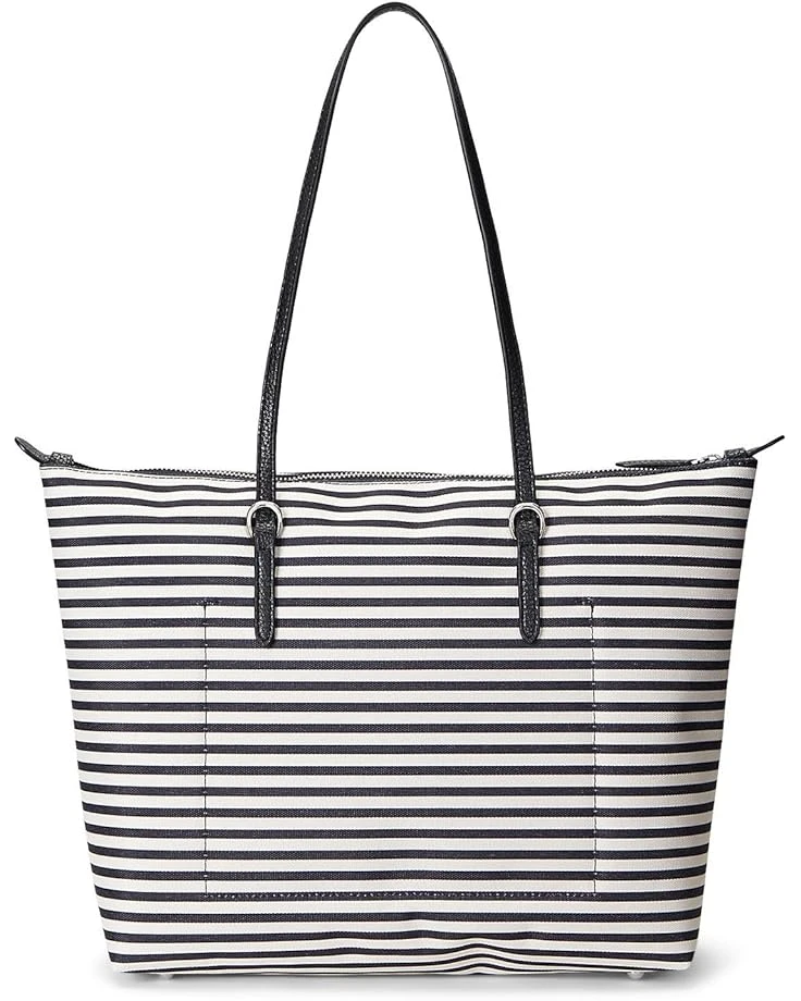 - Leave the ordinary bags and carry the LAUREN Ralph Lauren® Striped Nylon Medium Keaton Tote, your fashionable statement. Its vibrant stripes dance across the durable nylon canvas, offering a touch of playful sophistication. Luxe faux leather straps add a touch of polish, while the spacious interior swallows up your essentials with ease. The secure zippered closure keeps everything safe, and the iconic “LRL” logo adds a touch of heritage style.