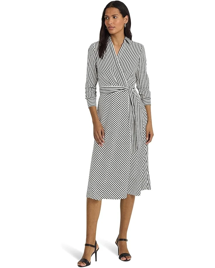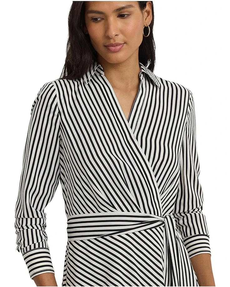 - Embrace effortless polish by wearing the LAUREN Ralph Lauren® Striped Surplice Midi Dress. The delicate stripes dance across luxurious crepe, offering a touch of sophistication. The surplice bodice flatters your figure, while the removable self-belt cinches your waist for a defined silhouette. Crisp pleats and buttoned cuffs add a touch of polish, and the concealed zipper ensures a smooth, streamlined look.